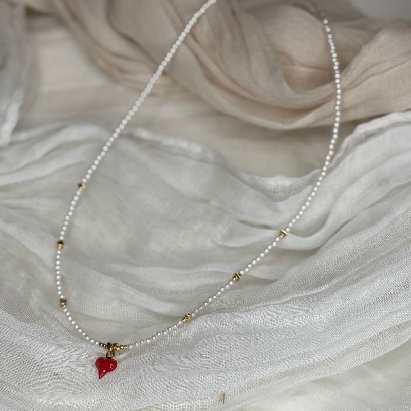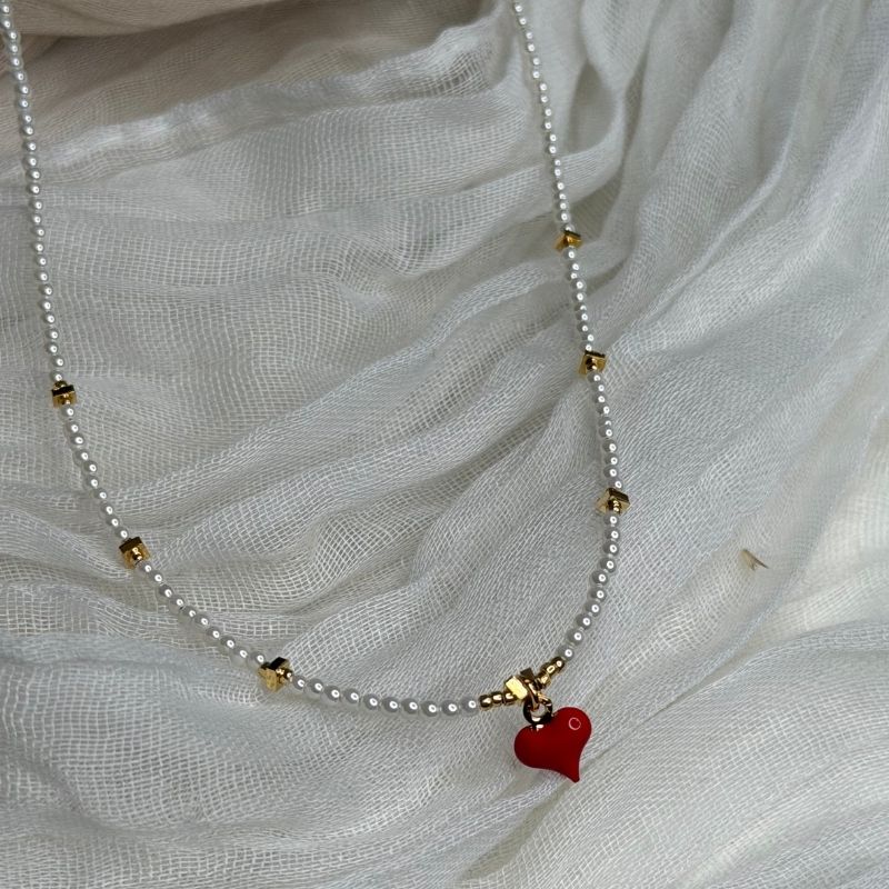 Χειροποίητο διακριτικό κολιέ με λευκά λεπτά γυαλιστερά μαργαριτάρια και μια κόκκινη καρδούλα στο τέλειο σχήμα να κρέμεται , συνδυάστε τα με τα αντίστοιχα σκουλαρικάκια.