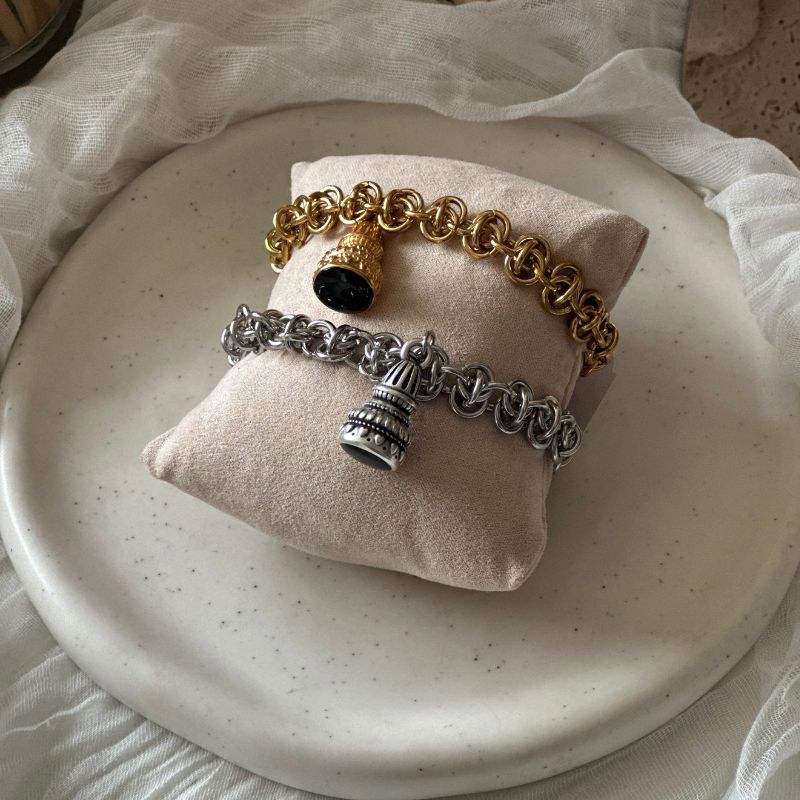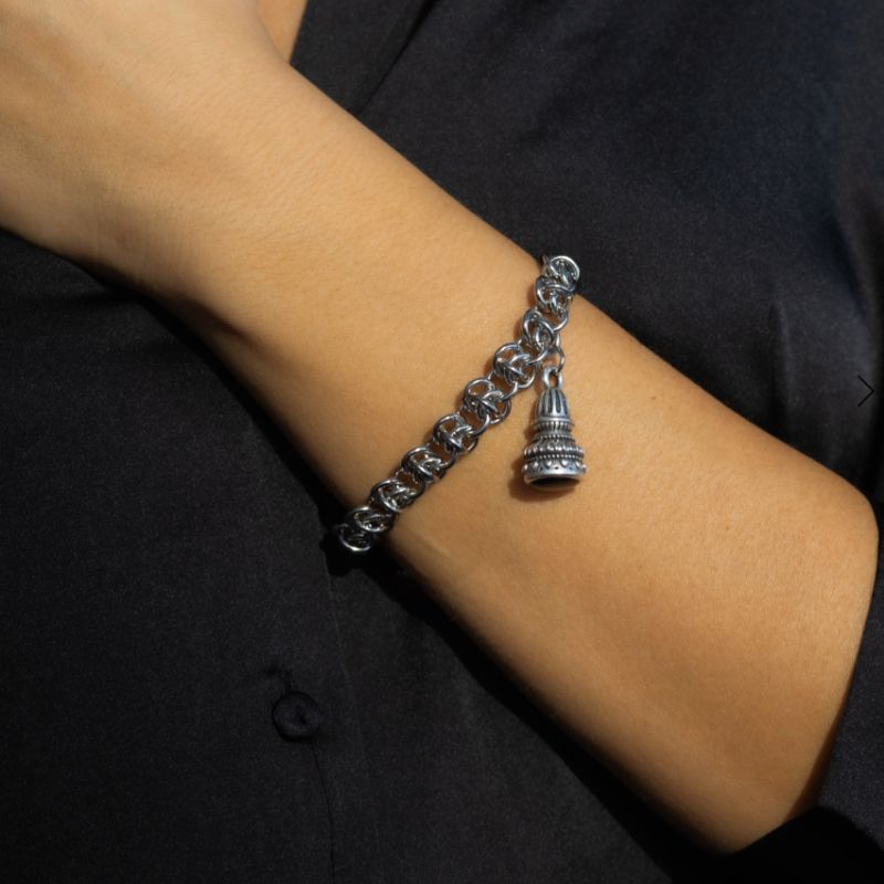 Βραχιόλι Bell με ατσάλινη αλυσίδα και κούμπωμα, συνδυασμένο με στοιχείο από ορείχαλκο επαργυρωμένο\ επιχρυσωμένο με διπλή επιμετάλλωση και μαύρο σμάλτο.
