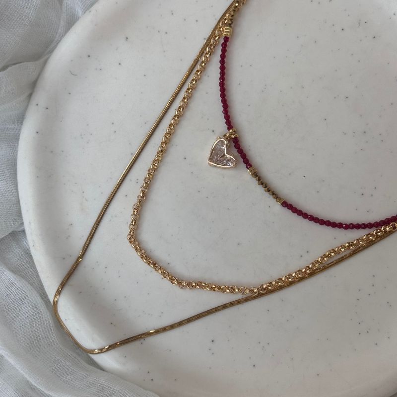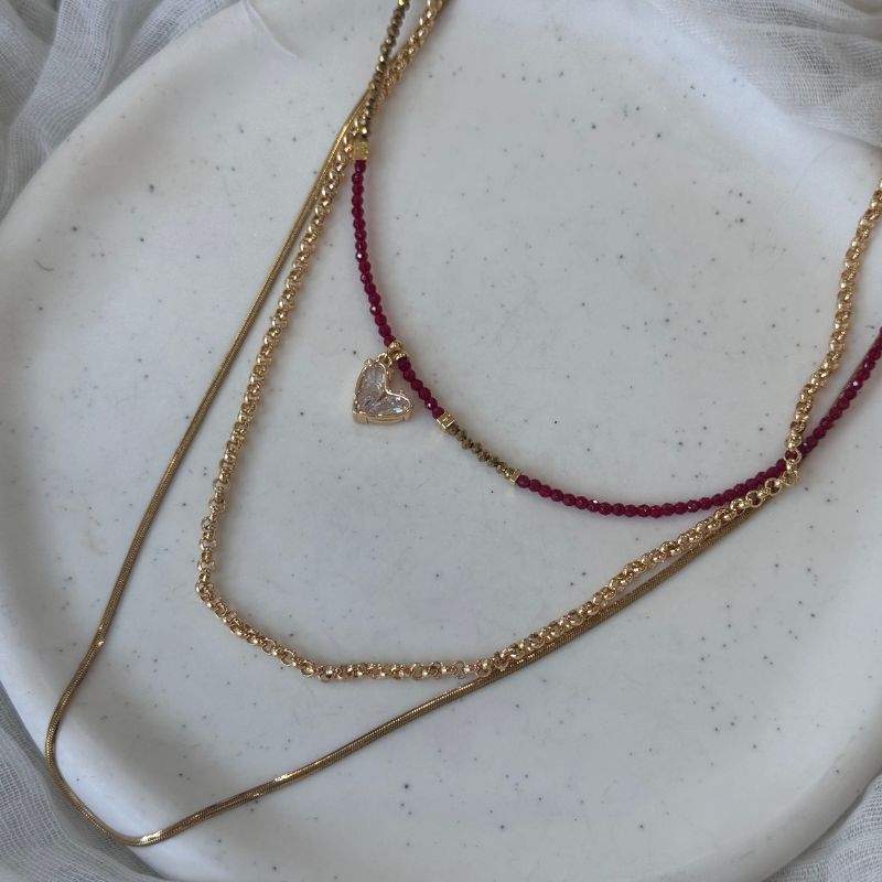 Χειροποίητο ατσάλινο κολιέ τριπλέτα με λαμπερές χάντρες και στοιχείο καρδούλα απο λαμπερό ζιργκον