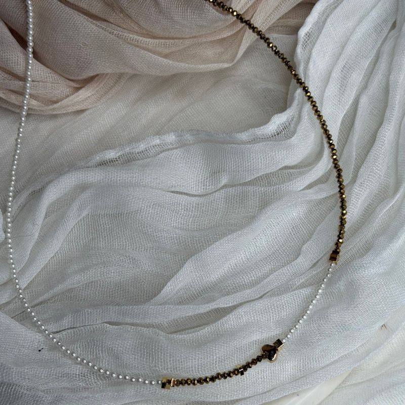 Χειροποίητο διακριτικό κολιέ με αιματίτη ( ημιπολύτιμος λίθος ) και γυαλιστερά μαργαριτάρια, σε χρυσό γυαλιστερό αιματίτη και λευκό μαργαριτάρι με μια διακριτική χρυσή καρδούλα που ενώνει απόλυτα το λευκό με το χρυσό .