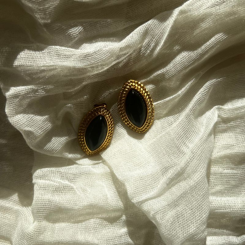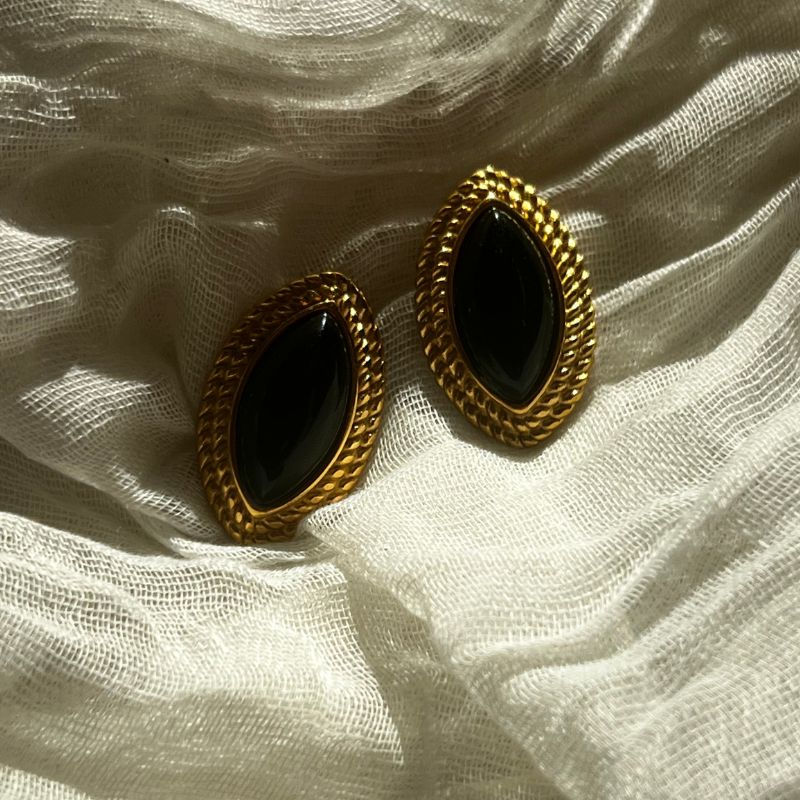 Σκουλαρίκια ατσάλινα, σε χρυσή επιλογή με μαύρη πέτρα στο κέντρο.