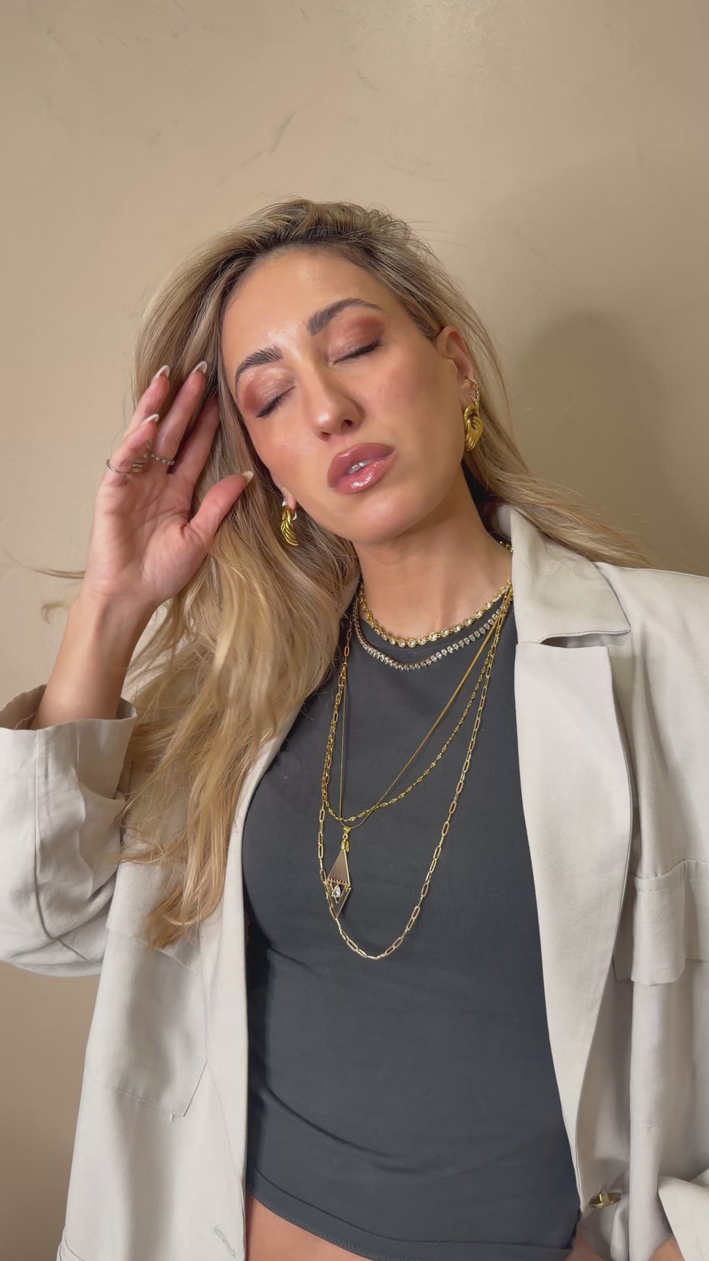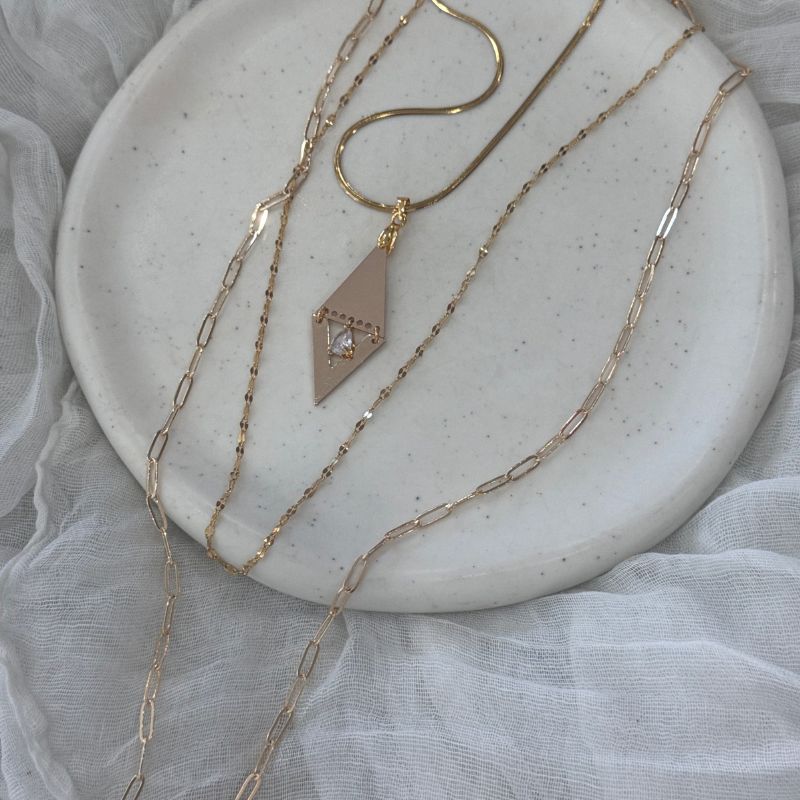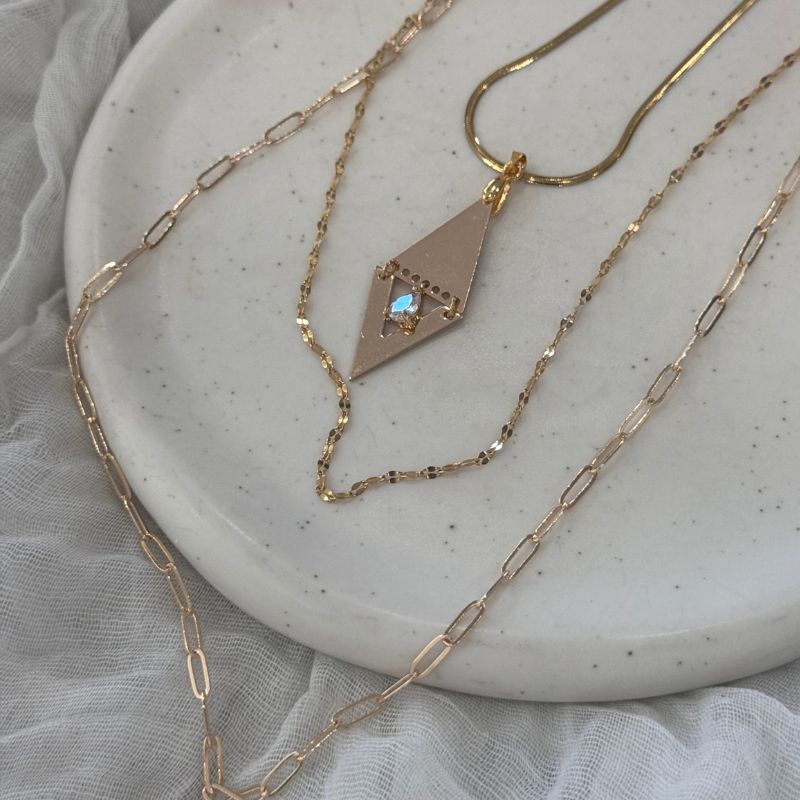 Χειροποίητο ατσάλινο μακρύ κολιέ  τριπλέτα με γεωμετρικό στοιχείο , λαμπερό ζιργκον.