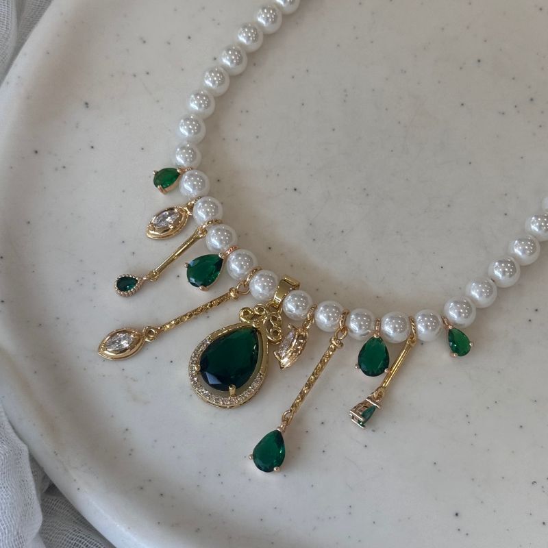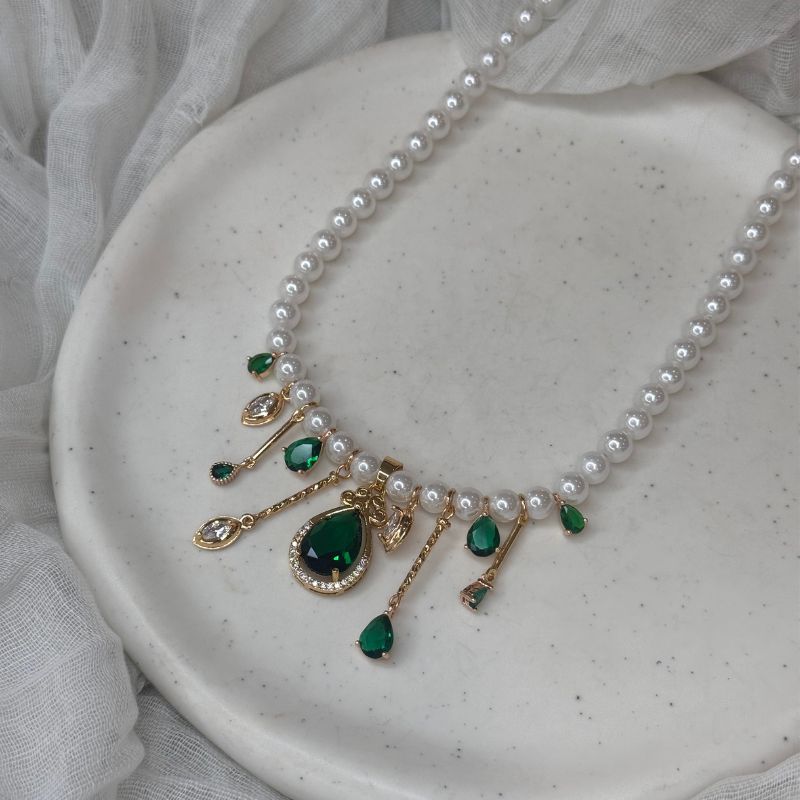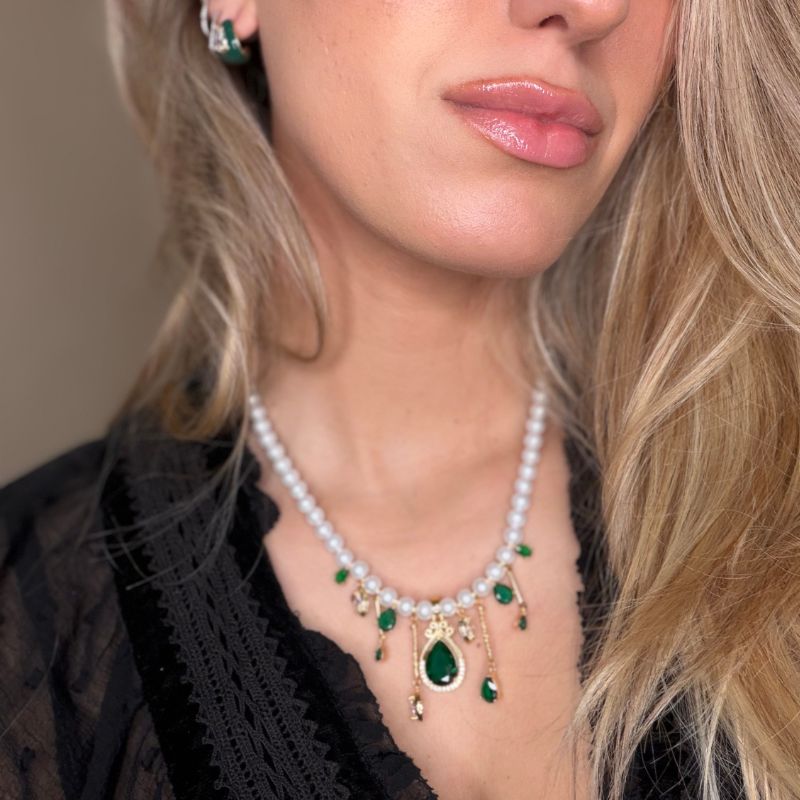 Χειροποίητο κολιέ με πέρλες του γλυκού νερού ,χρυσες λεπτομέριες και πράσινα κρύσταλλα.