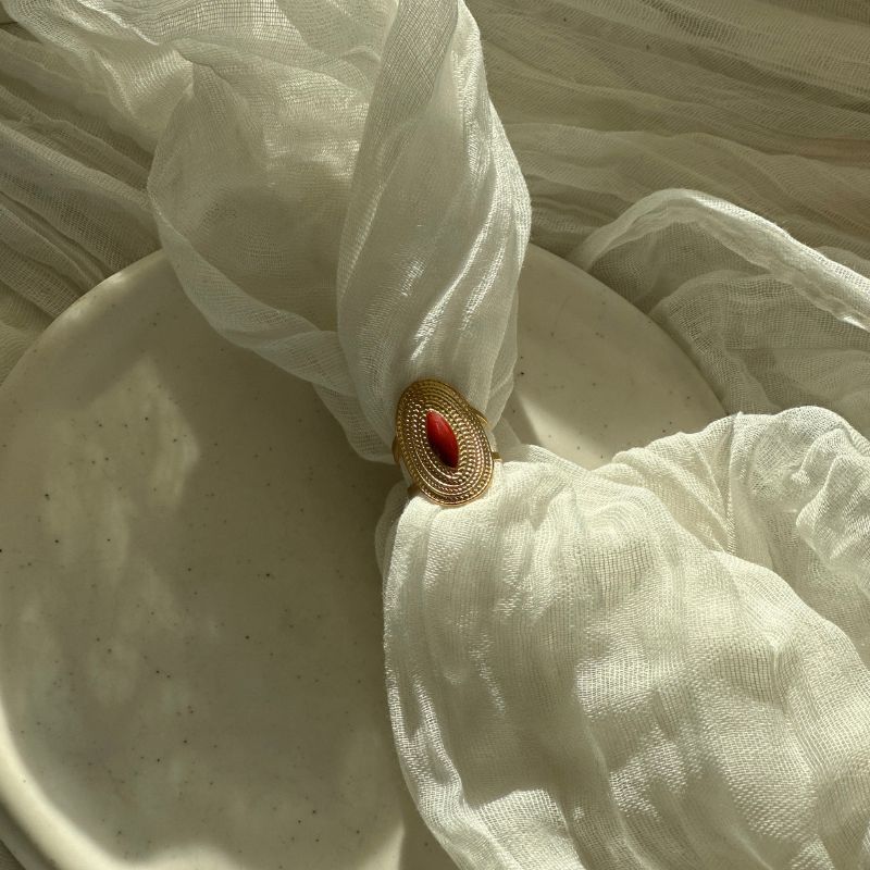 Ατσάλινο ανοιγόμενο δαχτυλίδι σε χρυσή απόχρωση με κόκκινη πέτρα στο κέντρο.