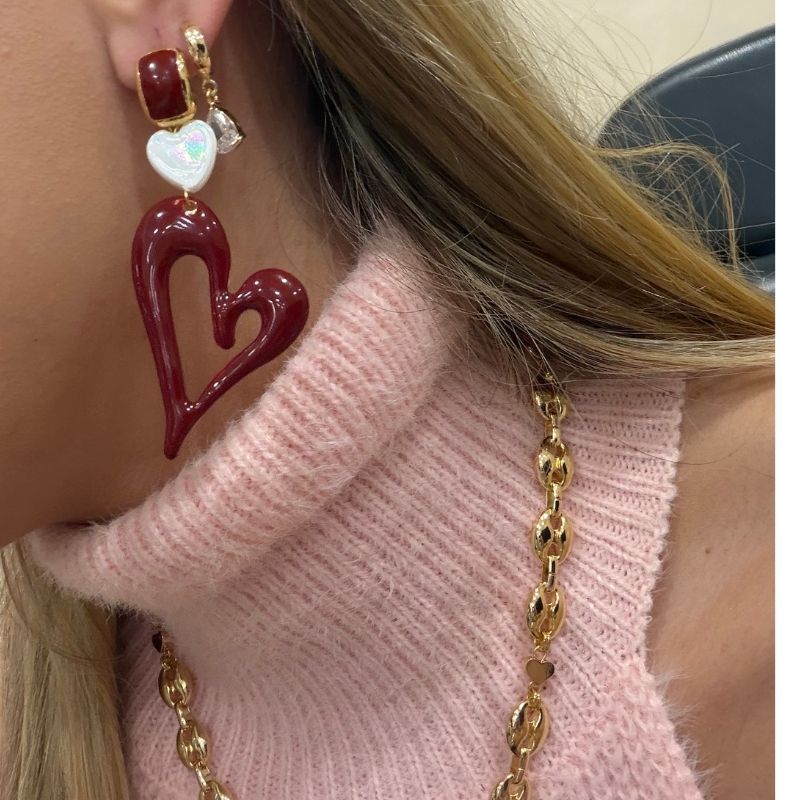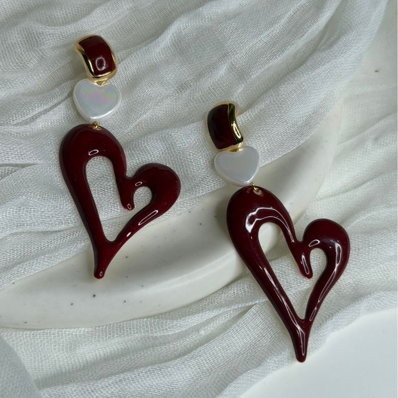 Χειροποίητα καρφωτά σκουλαρίκια με καρδιά απο πέρλα του γλυκού νερού, καρδιά απο μπορντό σμάλτο , λαμπερό ζιργκον και επιχρυσωμένη βάση