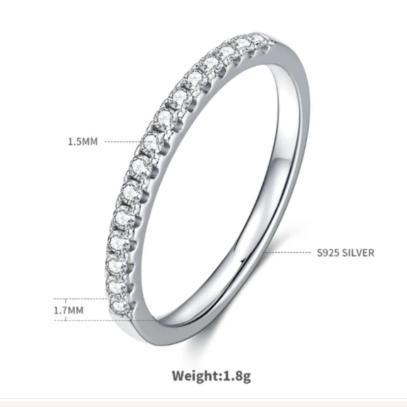 Λεπτό και κομψό eternity ring από ασήμι 925, διακοσμημένο με αυθεντική moissanite πέτρα υψηλής καθαρότητας. Συνοδεύεται από επίσημο Certificate για τη γνησιότητα και τα χαρακτηριστικά της πέτρας. Ένα premium, διαχρονικό κομμάτι με εξαιρετική λάμψη και αντοχή. Είναι half δηλαδή στο πίσω μέρος δεν έχει διαμαντάκια.